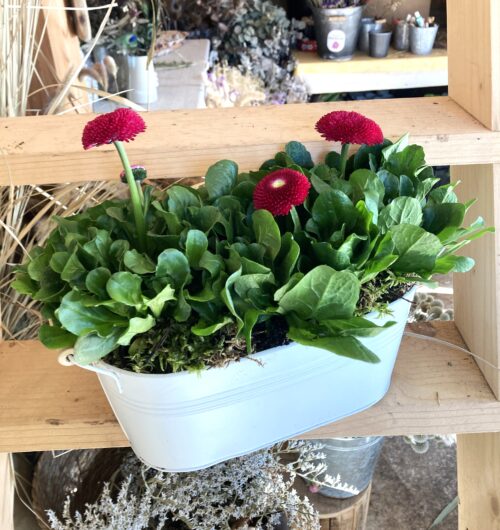 Composition de PrimevÚres et de lierre produits en France plantées en terre dans une jardiniÚre en zinc. Plantes vivaces, ne gÚlent pas.